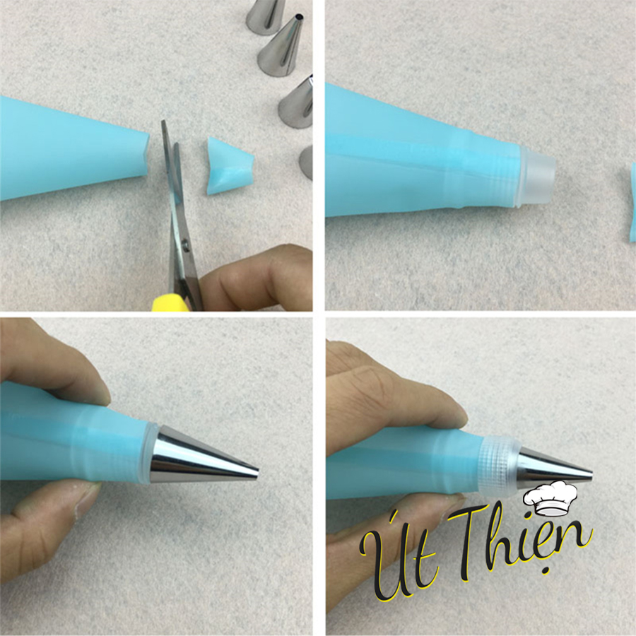 ✅ Bạn có thể sử dụng đui bắt kem theo 2 cách, một là gắn vào chốt đui – hoặc là cho thẳng vào túi bắt kem. Cách cầm túi bắt kem và đặt góc so với mặt bánh sẽ quyết định hình dáng của bông kem.