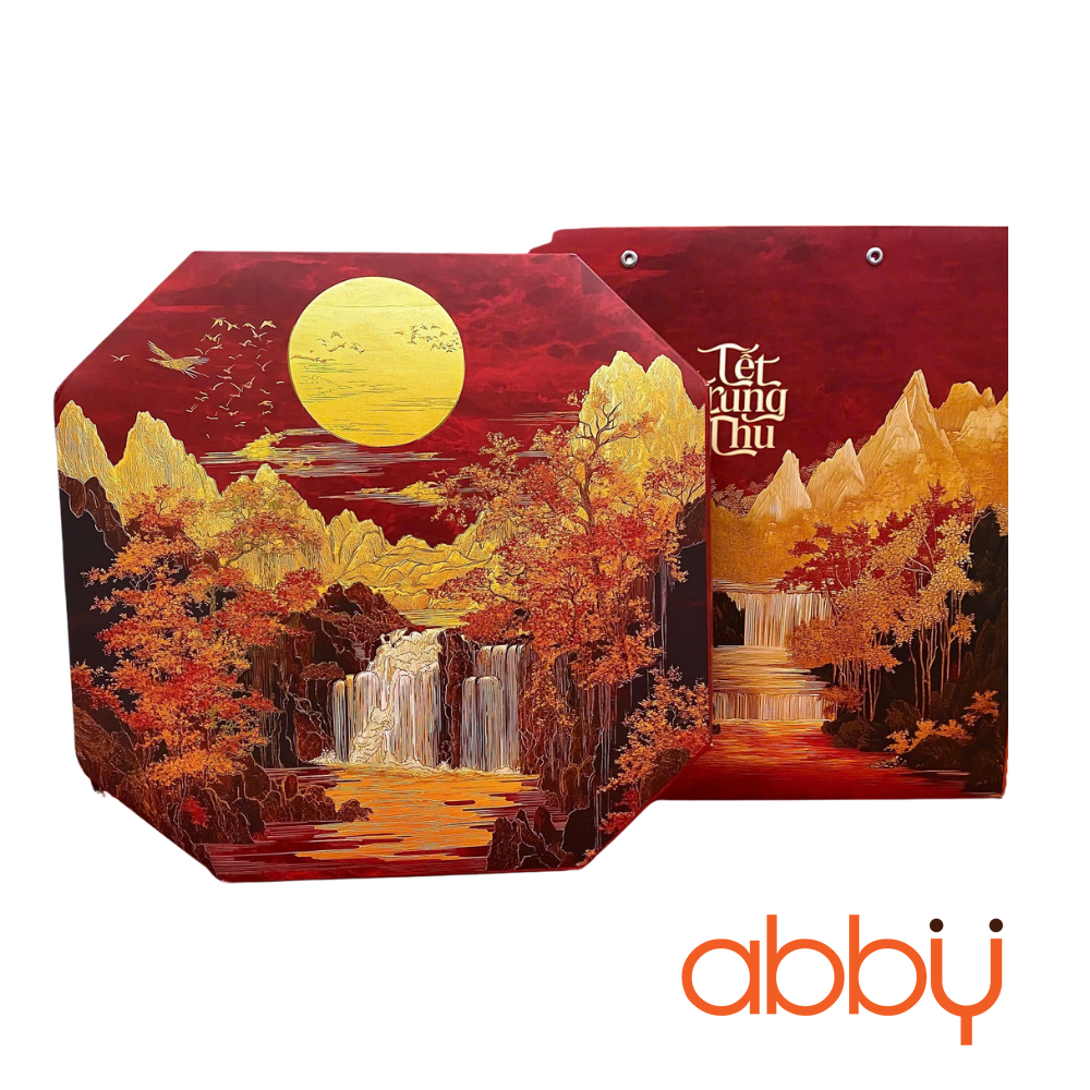 Bộ túi & hộp giấy 4 bánh trung thu 150-250g mẫu Kim Sơn được thiết kế sang trọng, lấy cảm hứng từ cảnh núi non hùng vĩ dưới ánh trăng vàng rực rỡ. Hộp bát giác độc đáo kết hợp gam đỏ – vàng ấm áp, tượng trưng cho sự đoàn viên và may mắn. Bộ sản phẩm gồm hộp chính và 4 hộp nhỏ bên trong, phù hợp đựng bánh trung thu 150–250g.