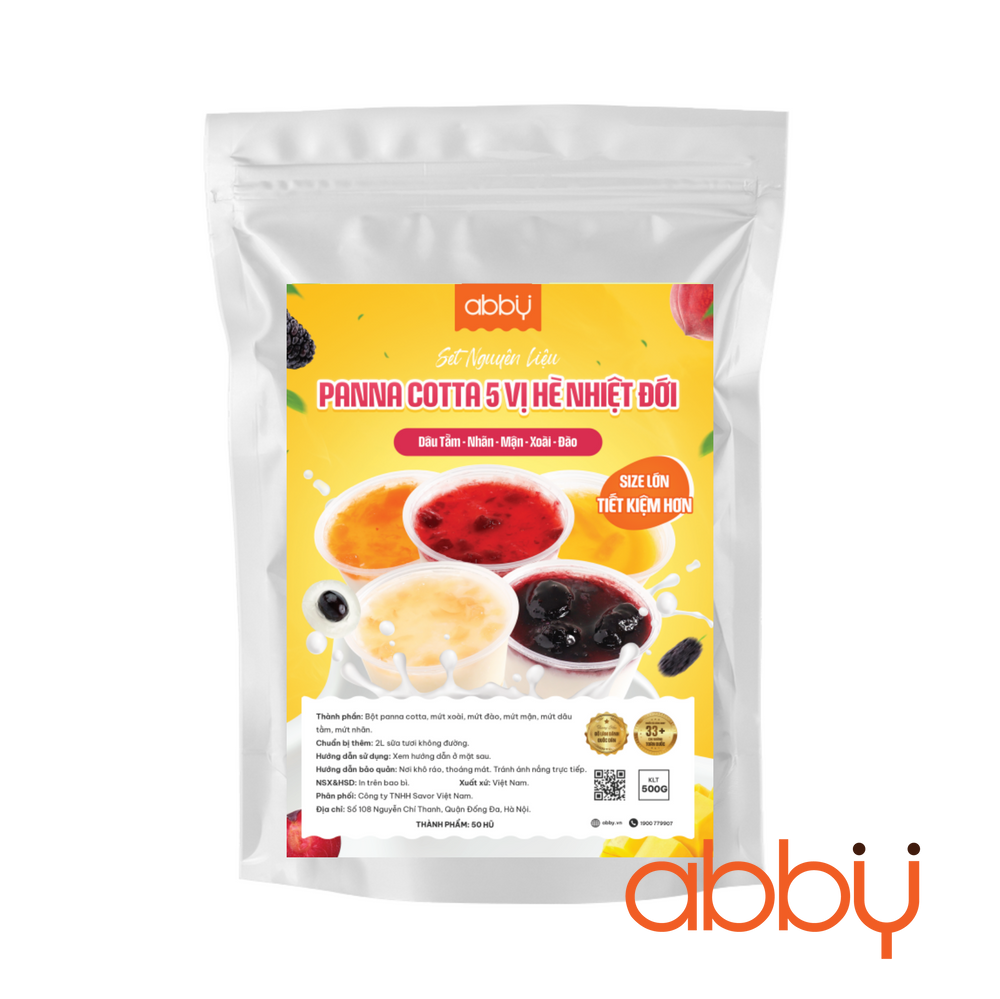 Set nguyên liệu làm Panna Cotta 5 vị hè nhiệt đới 50 hũ (siêu sốt) “hot hit” mùa hè với 5 hương vị trái cây nhiệt đới siêu mát lành: dâu tằm, nhãn, mận, xoài và đào. Chỉ cần vài bước đơn giản, bạn đã có thể tự tay làm nên 50 hũ panna cotta thơm ngon, mịn mượt, hấp dẫn như ngoài tiệm, phù hợp cho cả ăn tráng miệng, tặng quà hay bán hàng online.